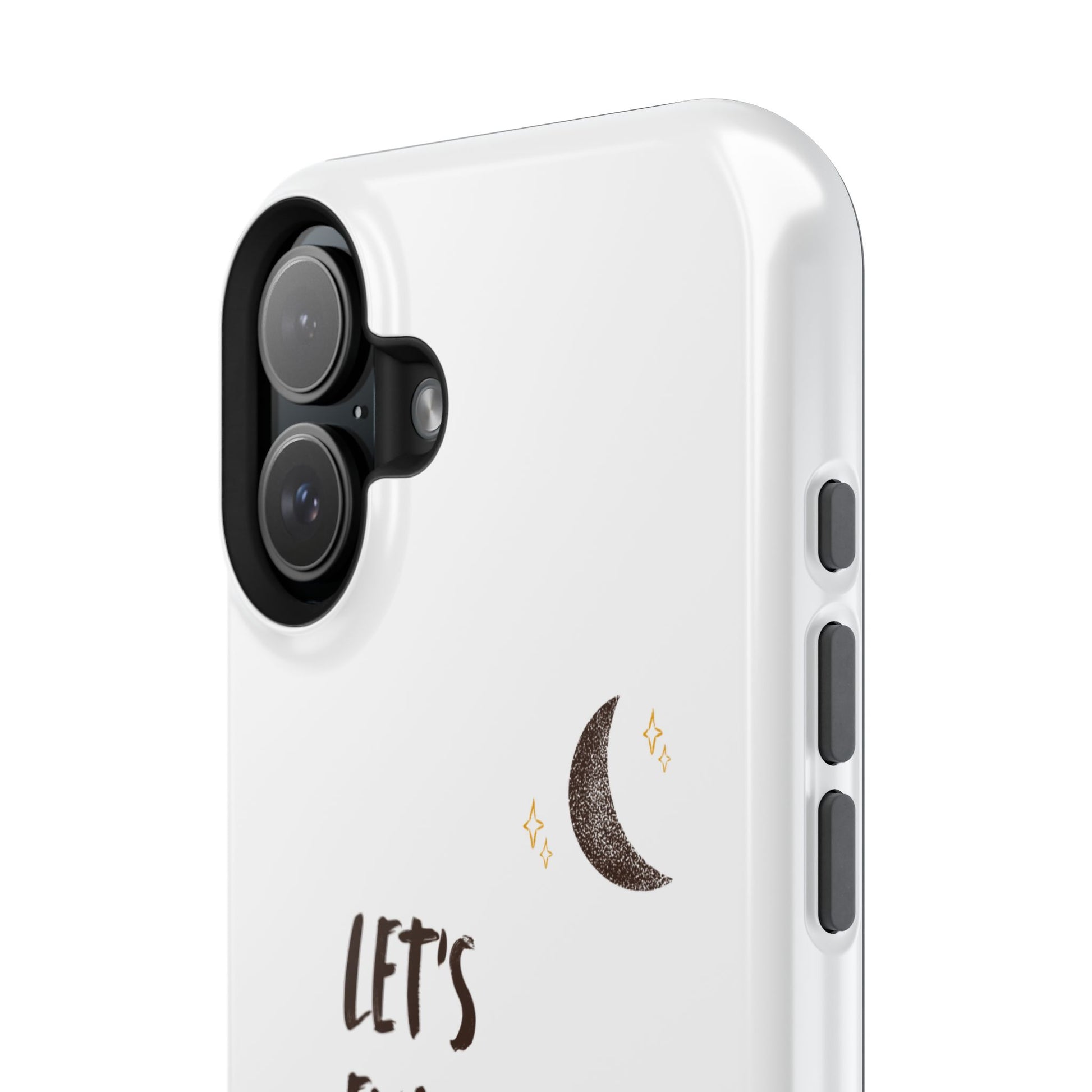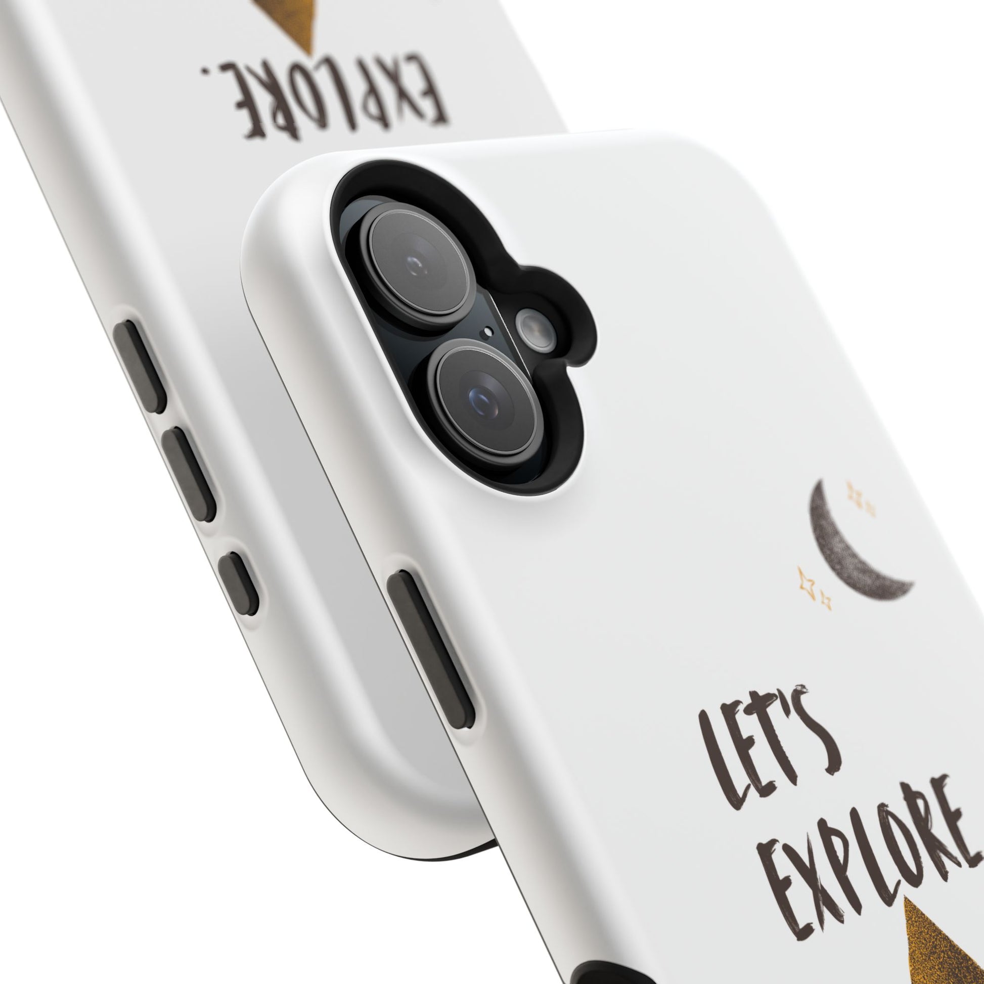Lightweight, protective phone case with a warm, wanderlust-ready illustration. The design features hand-drawn mountains, a retro camper van, and a crescent moon with the handwritten phrase “Let’s Explore.” It wraps fully around the exterior for uninterrupted artwork and comes in glossy or matte finishes so you can choose a slick shine or soft, velvety look. The dual-layer build—rigid polycarbonate shell with a removable black TPU liner—absorbs everyday bumps while staying compatible with wireless charging. This case feels like a tiny travel talisman on your phone, nudging you toward weekend road trips and quiet forest mornings.